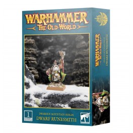 This multipart plastic kit builds one Dwarf Runesmith for Dwarfen Mountain Holds forces in games of Warhammer: The Old World. This stoic sage of smithing is clad in heavy armour and comes with a choice of two bearded heads. The kit includes a choice of two ritual hammers, and the Runesmith can also carry either a blazing rune clasped in a pair of tongs, or an ornate tome tucked under one arm.